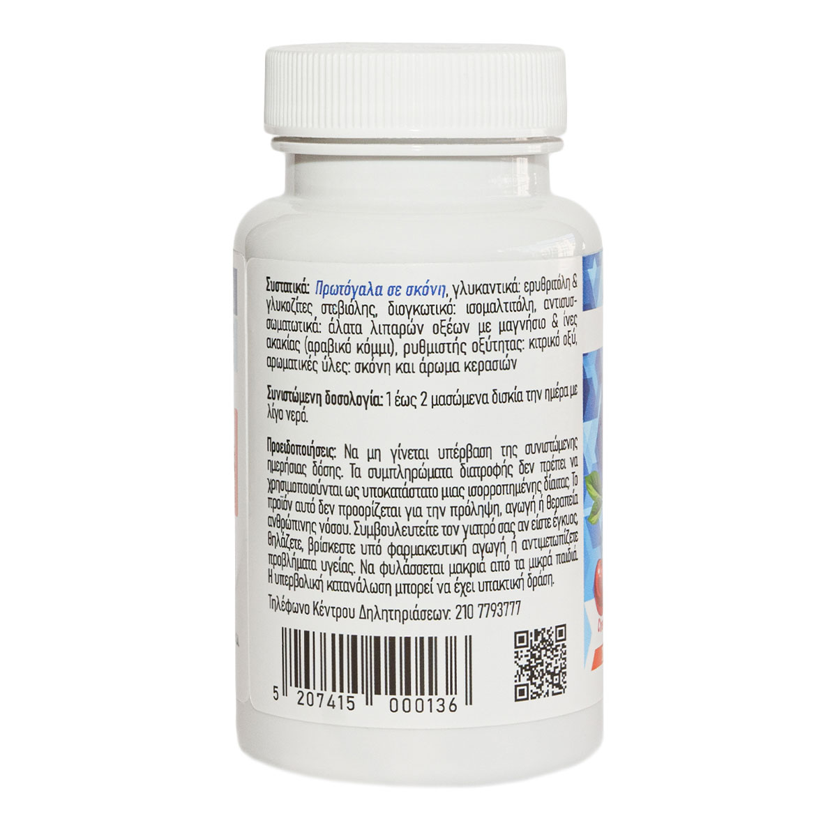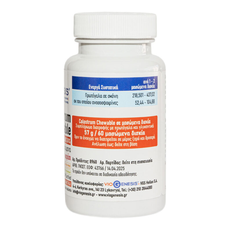 Το VioGenesis Colostrum Chewable είναι ένα συμπλήρωμα διατροφής με πρωτόγαλα σε μασώμενα δισκία με γεύση κεράσι και γλυκαντικά.