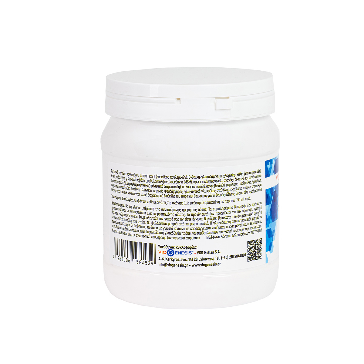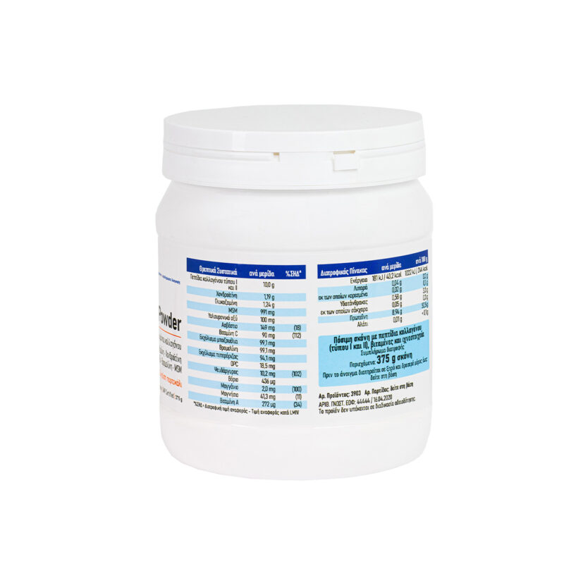 Πόσιμο υδρολυμένο κολλαγόνο τύπου Ι & ΙΙ σε σκόνη μαζί με θειική χονδροϊτίνη, θειική γλυκοζαμίνη, υαλουρονικό oξύ και MSM. Συμβάλει διατροφικά στην υγιή λειτουργία των αρθρώσεων και των συνδέσμων.