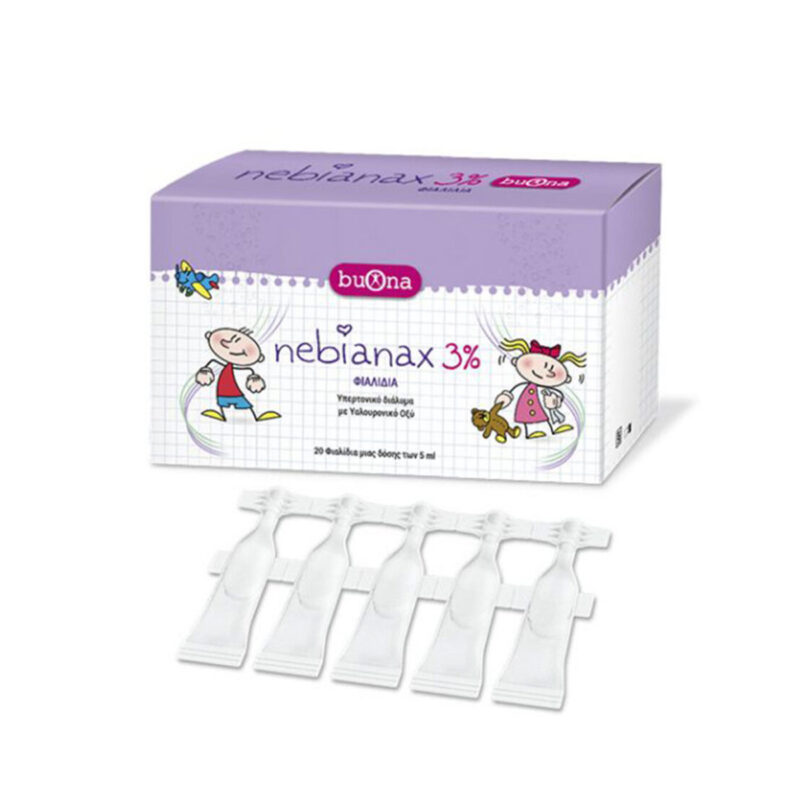 Το NEBIANAX 3% φιαλίδια είναι ένα υπερτονικό αλατούχο διάλυμα 3% με την προσθήκη Υαλουρονικού Οξέος.