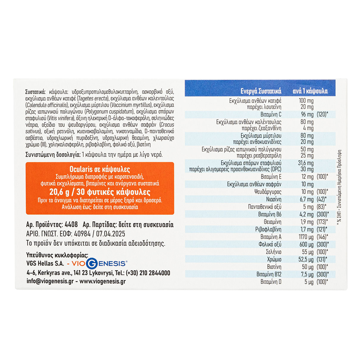 To VioGenesis Ocularis είναι μια φόρμουλα με βιταμίνες, ανόργανα συστατικά και φυτικά εκχυλίσματα, τα οποία, μεταξύ άλλων, παρέχουν λουτεΐνη, ζεαξανθίνη και ανθοκυανιδίνες. Χάρη στη σύνθεσή του, το VioGenesis Ocularis συμβάλλει στη διατήρηση της φυσιολογικής όρασης.