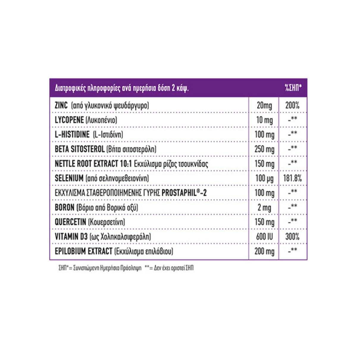 Συμπλήρωμα διατροφής με φυτοστερόλες, λυκοπένιο, ψευδάργυρο, αμινοξέα και φυτικά εκχυλίσματα που υποστηρίζουν τη φυσιολογική λειτουργία του προστάτη