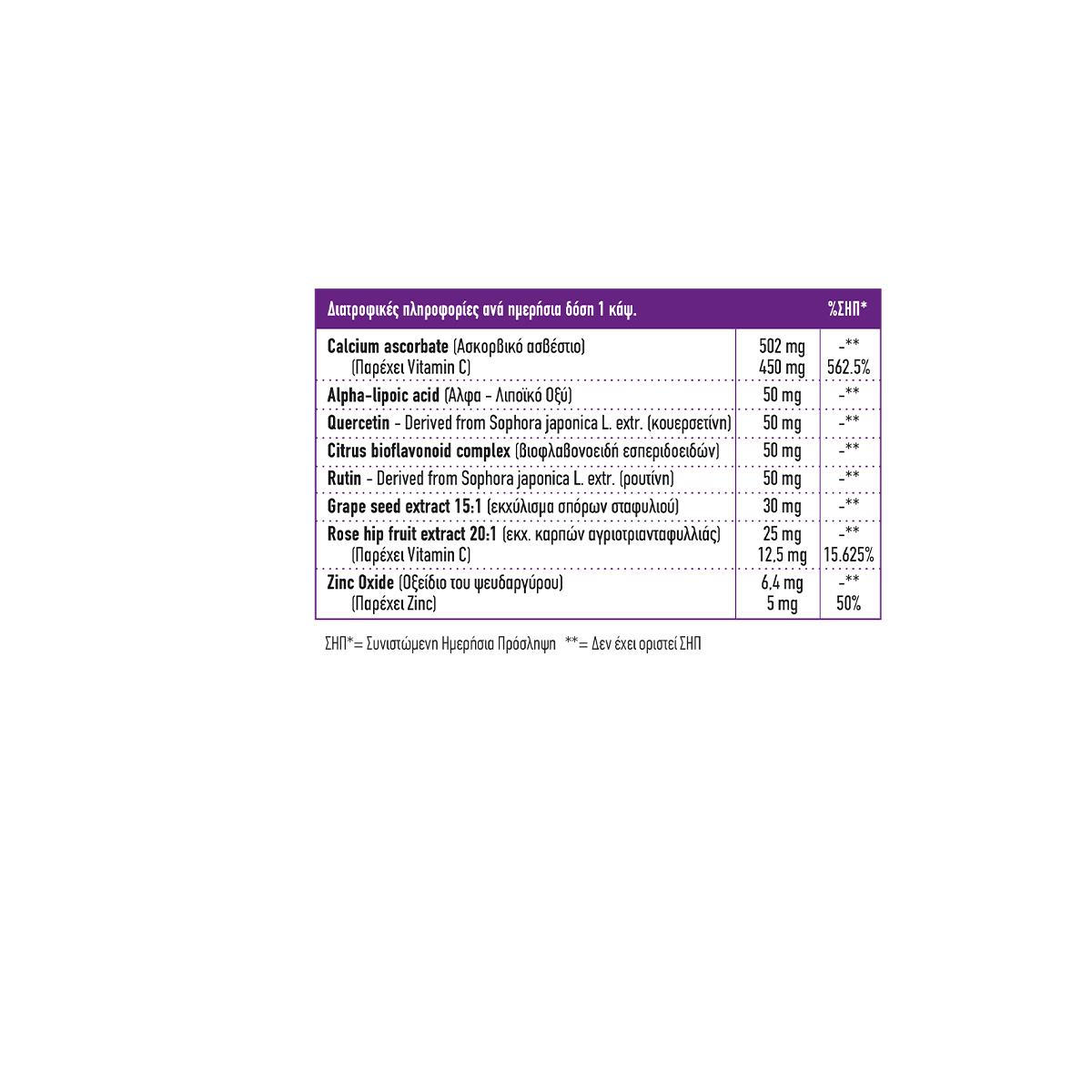 Βιταμίνη C από φυτική πηγή με την μορφή ασκορβικού ασβεστίου, που είναι φιλική προς το στομάχι. Επιπλέον, ο συνδυασμός της με τα υπόλοιπα θρεπτικά συστατικά και εκχυλίσματα ενισχύει τη δράση της.7