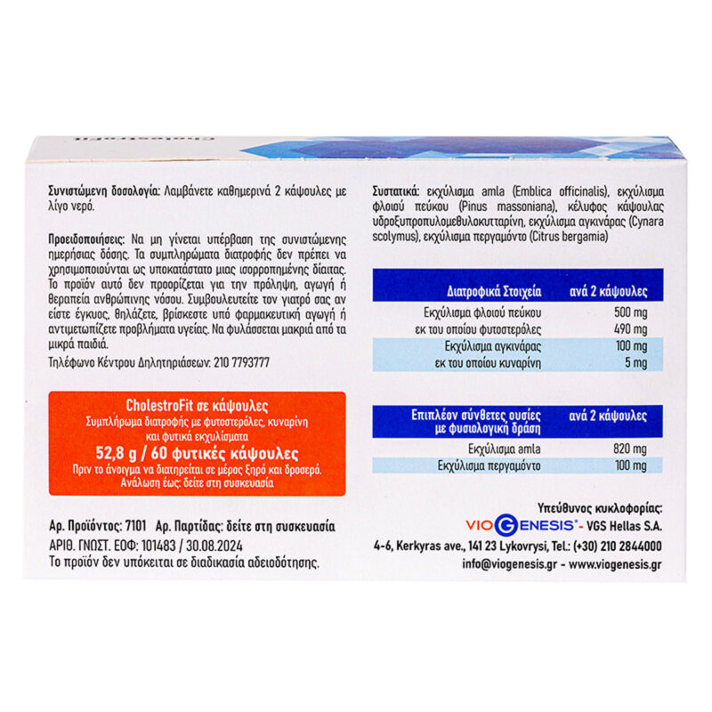 To VioGenesis CholestroFit είναι μια φόρμουλα με φυτοστερόλες από εκχύλισμα πεύκου, εκχύλισμα amla, εκχύλισμα αγκινάρας και εκχύλισμα περγαμόντο. Χάρη στη σύνθεσή του, το VioGenesis CholestroFit συμβάλλει στη διατήρηση των φυσιολογικών επιπέδων χοληστερόλης στο αίμα.